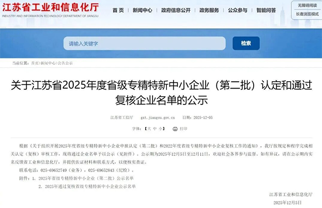 近日,江苏省工业和信息化厅正式公示了江苏省2025年度省级专精特新中小企业(第二批)认定和2022年度省级专精特新中小企业通过复核的企业名单,15vip太阳集团(中国)有限公司官网入口 (以下简称“15vip太阳集团”)凭借在工业废水处理深度回用与资源化利用领域的卓越技术创新能力、显著的市场竞争优势以及突出的行业引领示范作用,成功通过此次复核,再次荣膺“省级专精特新中小企业”称号。标志着公司在专业化、精细化、特色化、新颖化发展道路上迈出了更为坚实的一步,也意味着15vip太阳集团长期深耕废水处理环保领域所取得的成果获得了权威认可!