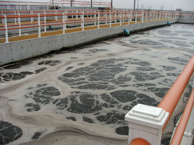 4、曝气池或二沉池中出现大量泡沫,并有恶臭味,则可能是由于丝状菌异常生长,与气泡、絮体颗粒混合积聚。这一类泡沫是比较难以处理的,很可能造成后期污泥硝化产生大量表面泡沫。可通过降低曝气,或通过投加调节水中的营养平衡,减少水量,降低BOD负荷,增加DO浓度,采用推流式曝气池,促进污泥絮凝等进行处理。